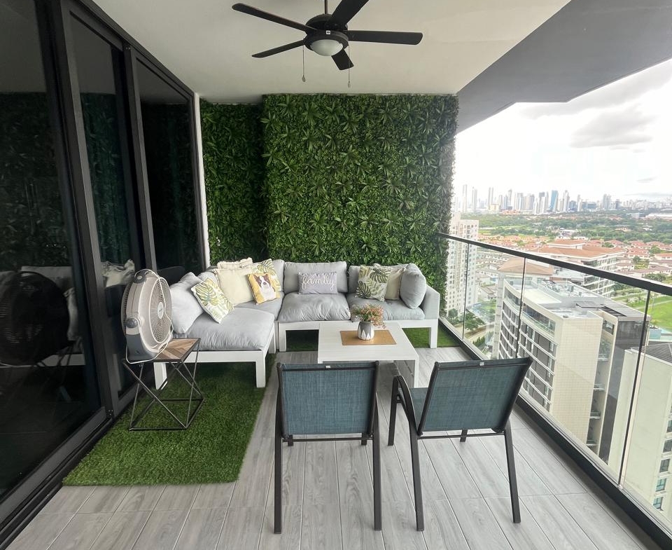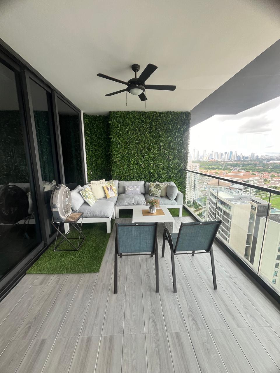 El balcón privado ofrece una vista abierta a la ciudad, ideal para relajarse o compartir momentos especiales. Incluye baño auxiliar, perfecto para visitas.