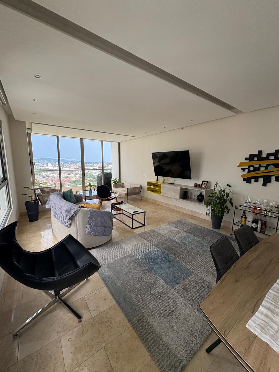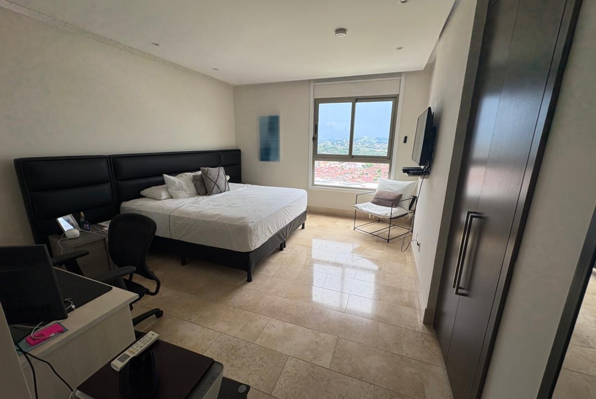 Amplio y remodelado apartamento de 214 m² en piso alto, con una distribución moderna y funcional. La propiedad cuenta con un diseño renovado que amplía el área de sala y comedor al integrar el balcón, creando un espacio social más grande y luminoso con vista a la ciudad.